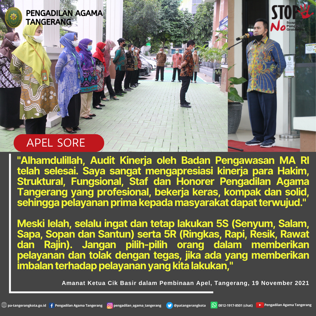 Apel Sore Aparatur Pengadilan Agama, Ketua Pengadilan Agama Apresiasi Kinerja Hakim, Struktural, Fungsional, Staf dan Honorer Pengadilan Agama Tangerang yang atas Pelayanan Prima Kepada Masyarakat