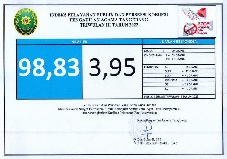 INDEKS PELAYANAN PUBLIK DAN PERSEPSI KORUPSI PENGADILAN AGAMA TANGERANG TRIWULAN III TAHUN 2022