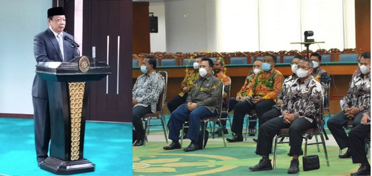 Ketua Pengadilan Agama Tangerang Cik Basir Mendengarkan Sambutan Direktur Jendral Badan Peradilan Agama Mahkamah Agung Republik Indonesia Aco Nur, Pada Acara Komitmen Bersama 3 (Tiga) Wilayah Pengadilan Tinggi Agama Secara Live