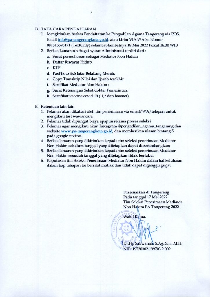 Pengumuman Calon Mediator Non Hakim Pengadilan Agama Tangerang Tahun 2022